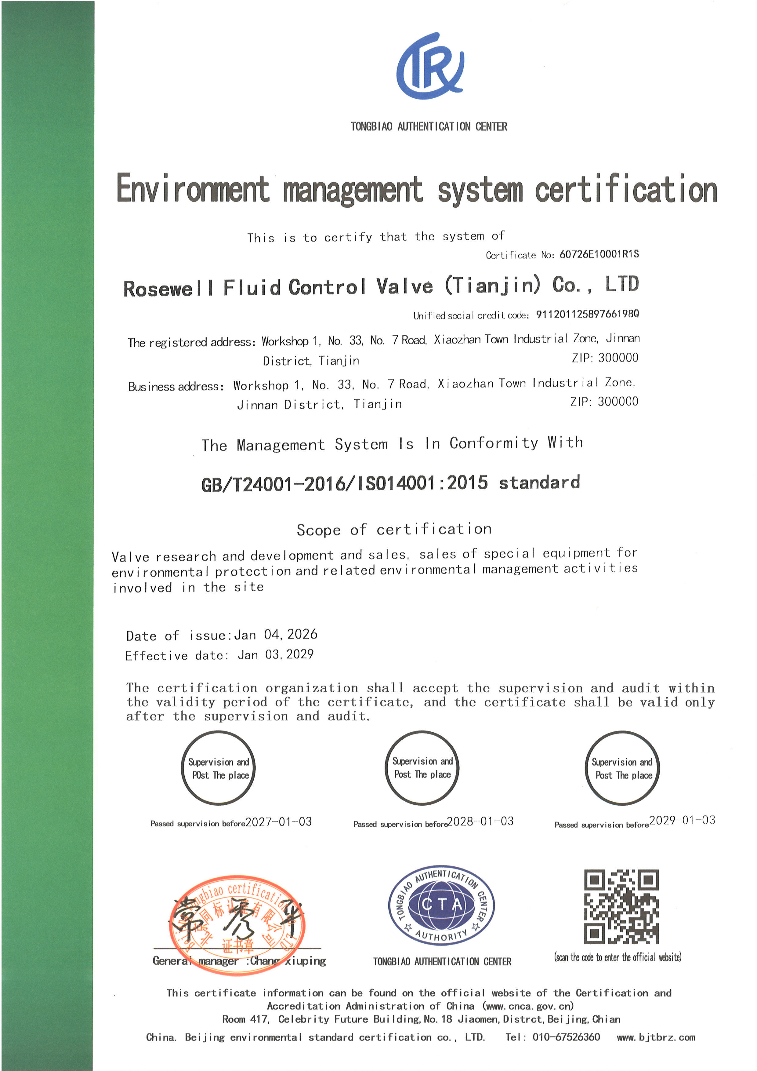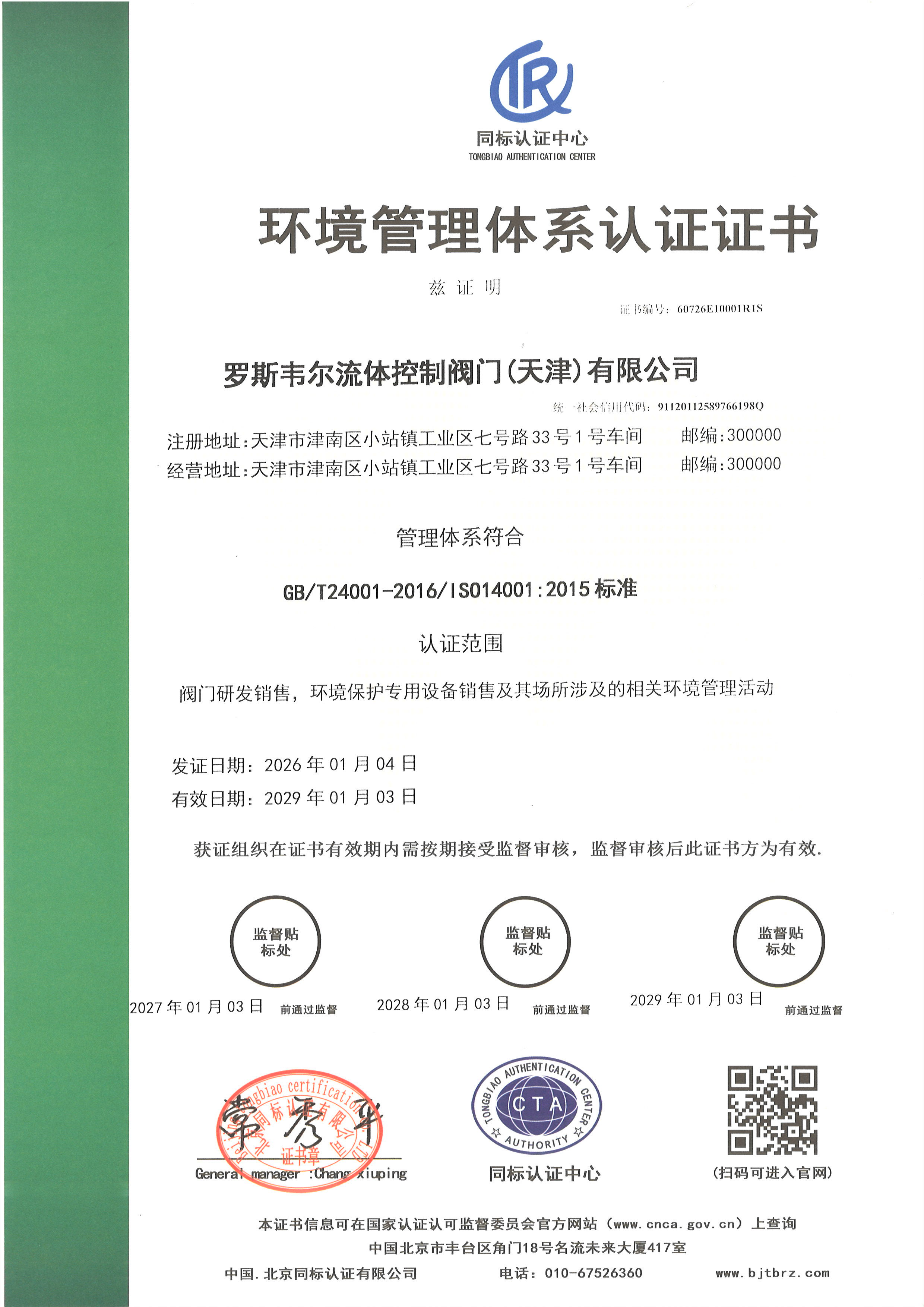 环境管理体系认证证书中文