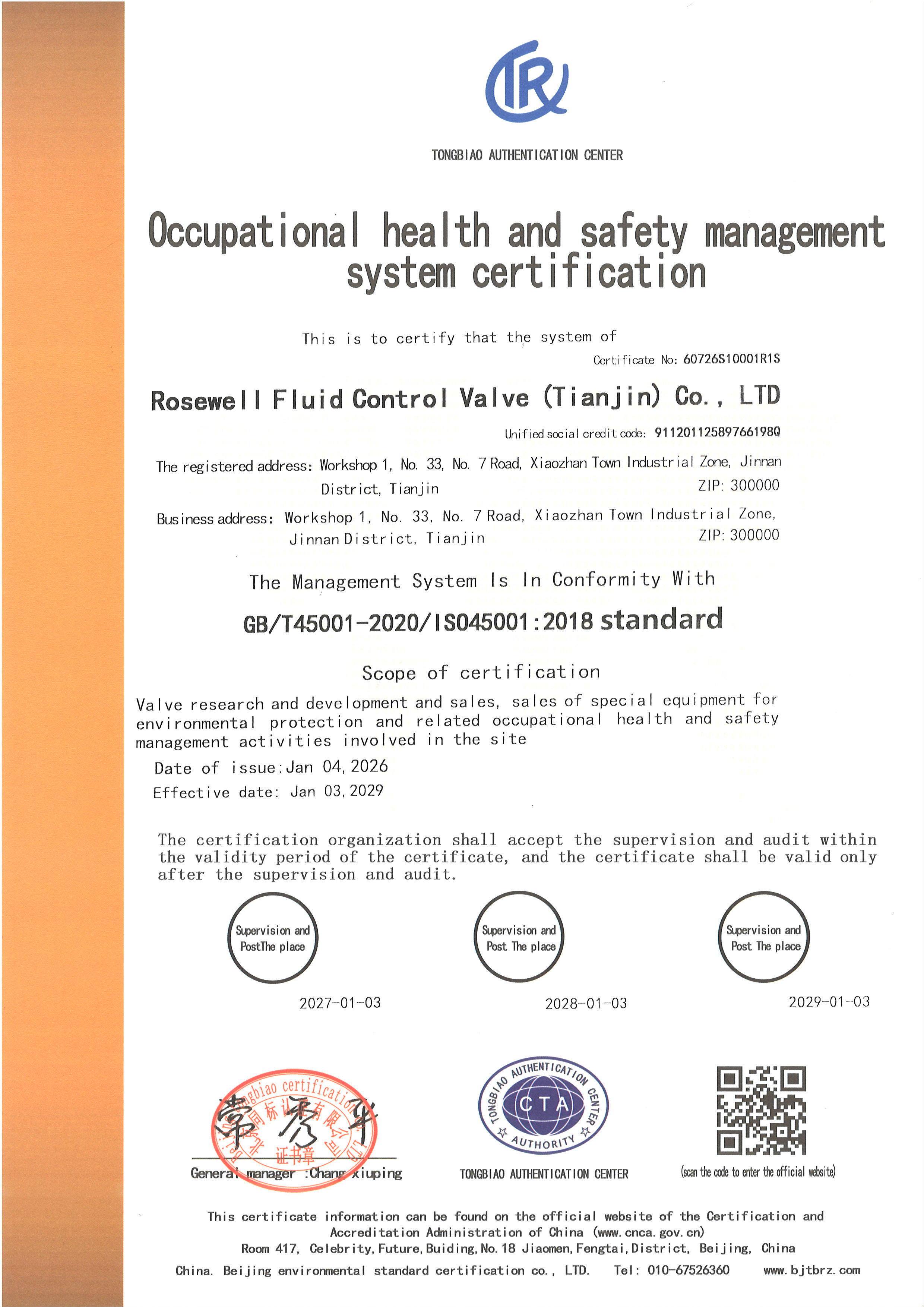 职业健康安全管理体系认证证书中文